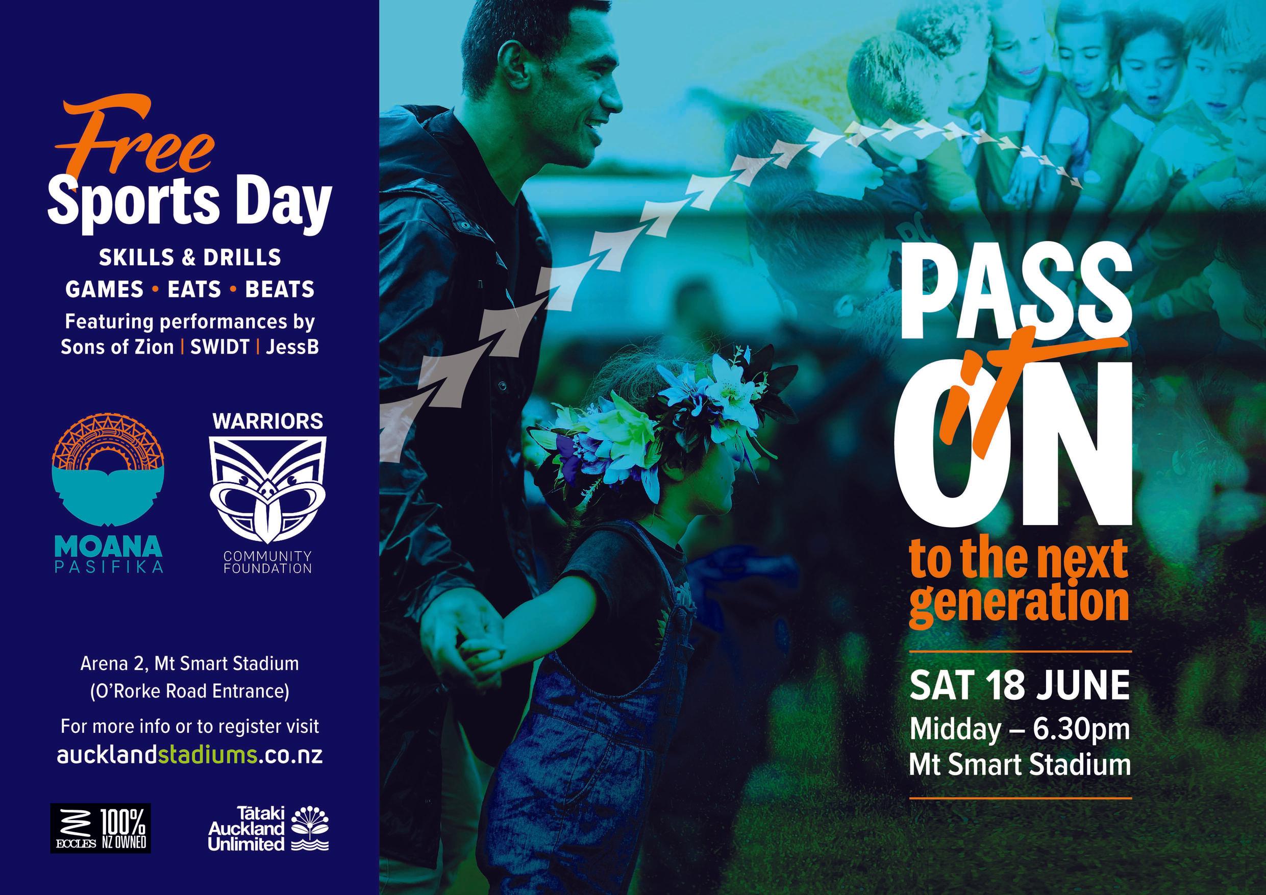 'Pass It On' day will be an opportunity for tamariki to have the community teams from Moana Pasifika and the Vodafone Warriors (Warriors Community Foundation) take you through skills & drills to up your game.